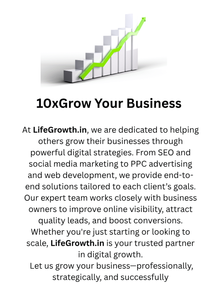 At LifeGrowth.in, our vision is to become India’s most trusted and result-driven digital marketing agency, empowering businesses of all sizes to grow, scale, and succeed in the digital world.